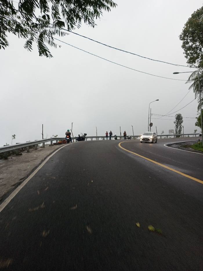 A winding road with a yellow line stretches into the distance under a foggy sky. On the left side of the road, a metal guardrail borders a scenic viewpoint where several people and motorcycles are gathered. A white car drives along the right side of the road. Utility poles and wires are visible against the overcast sky. The trees frame the image at the top.