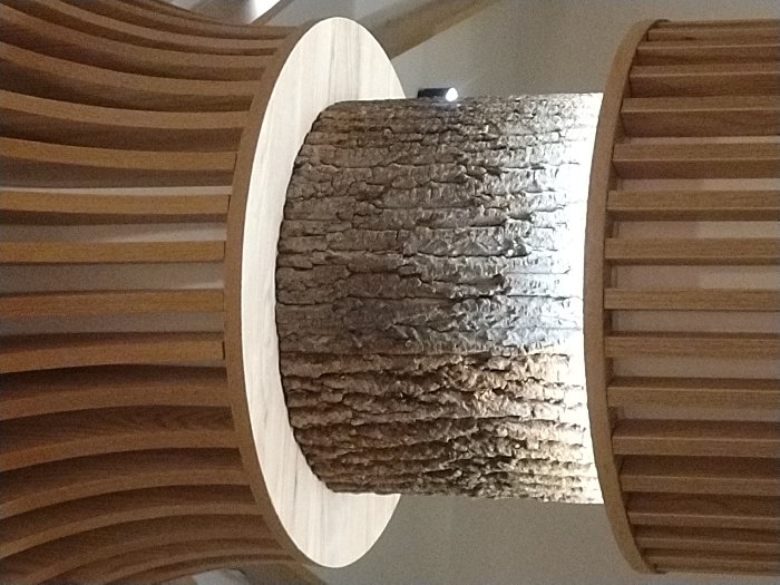 A section of tree trunk fills the center, the rough bark illuminated by hidden lighting. Circular wooden frames encircle the trunk, a lighter wood tone contrasting with the darker bark. Curved, horizontal wooden slats extend outwards from each frame, creating a layered, tunnel-like effect. The entire structure appears to be an artistic installation or architectural feature.