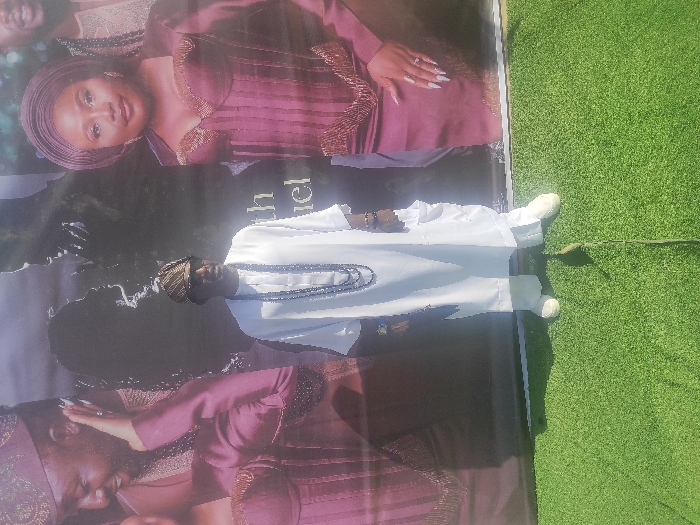 A man stands in front of a large poster featuring a woman in a purple dress with gold trim. The man is wearing a white outfit with a black beaded necklace and dark sunglasses. He stands on a green artificial turf. The poster appears to be for an event or wedding, with the text "with h el" visible on the left side.