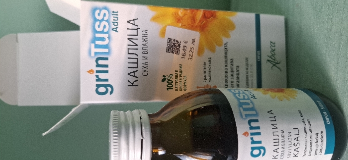 - "The image displays a dark amber glass bottle of GrinTuss Adult cough syrup positioned in front of its open white retail packaging box" by FM-7OVhF2, licensed under CC BY 4.0