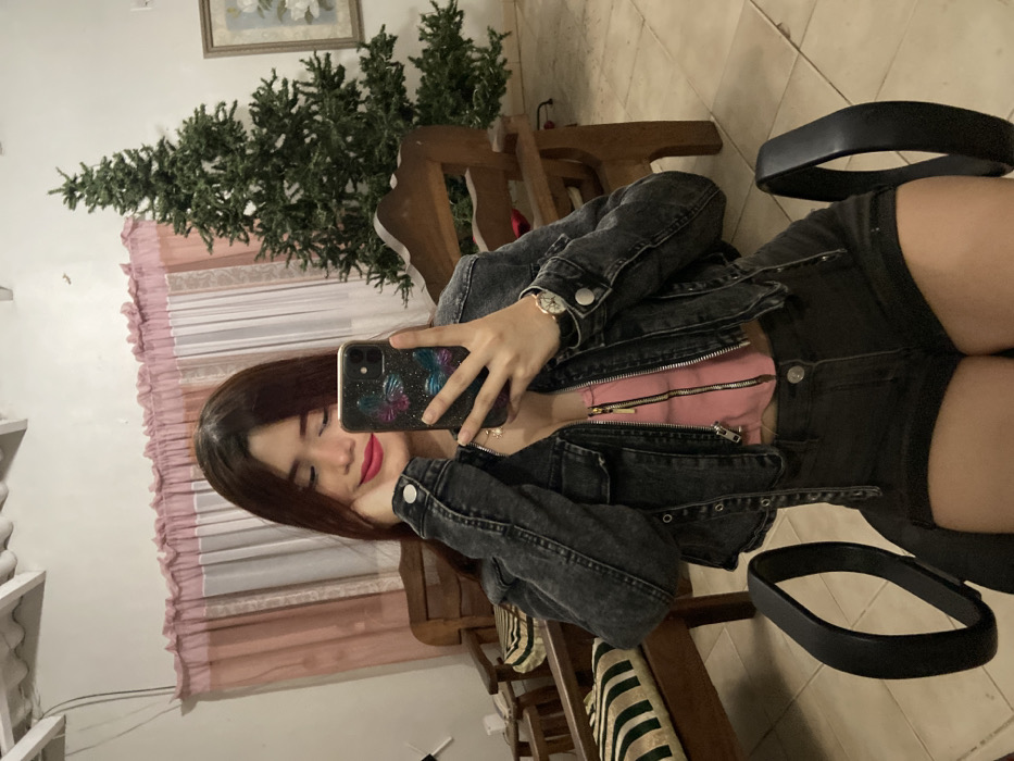 A woman is taking a selfie while sitting on a chair. She is wearing a dark denim jacket over a pink top and dark shorts. She has long, dark hair and red lipstick. A Christmas tree stands in the background near a framed picture. The room has a beige floor and pink curtains.