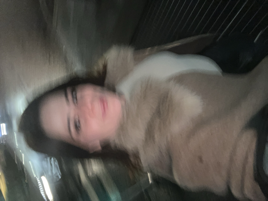 A young woman is photographed in a blurry image, likely taken while in motion. She wears a beige, fur-trimmed jacket over a white top. Her face is somewhat obscured by the motion blur, but her features are still discernible. The background appears to be an urban environment at night, with blurry lights and structures visible. A metallic grate-like structure can also be seen in the background. The overall image has a casual, candid quality.
