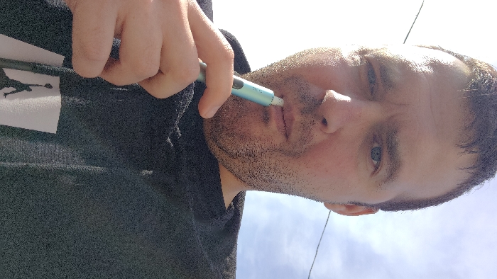 An adult male is depicted in a close-up, selfie-style photograph, outdoors under bright conditions. He has short dark hair, blue eyes, and visible stubble. He is wearing a dark grey or black hooded sweatshirt featuring a white graphic of a silhouetted figure in mid-air, consistent with the Jumpman logo, on the lower left portion. The man is holding a light blue and black electronic device, resembling a heated tobacco device or vape pen, to his mouth with his right hand. The device has a white tip inserted between his lips. His expression is neutral as he looks directly into the camera. The background consists primarily of a bright, light blue sky with some scattered clouds, indicating an outdoor setting. A thin, dark utility wire is visible traversing the upper right quadrant of the sky. The specific location within Odesa, Ukraine, cannot be determined from the visual evidence provided in the image.