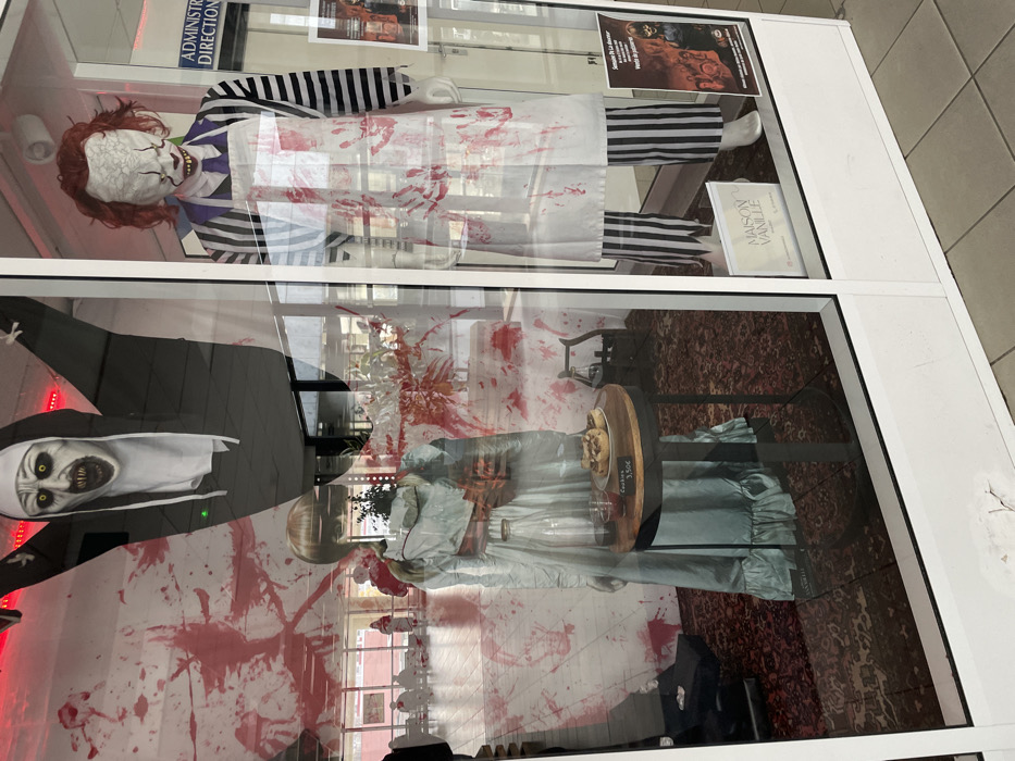 A storefront window display in Schiltigheim, France, presents a horror-themed arrangement