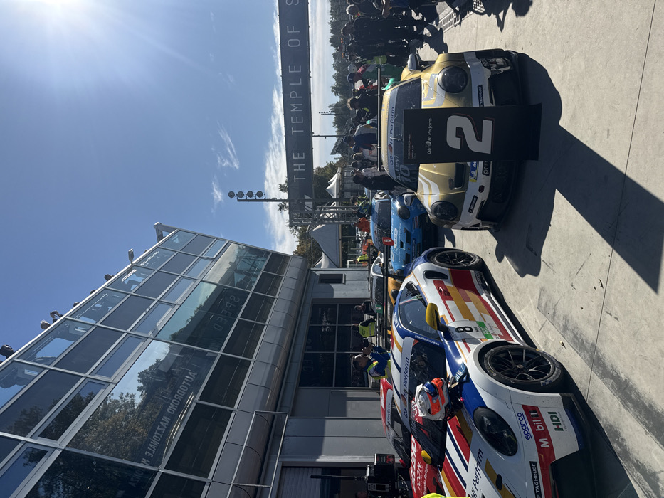 The image depicts a bright, sunny day at the Autodromo Nazionale Monza, located in Monza, Italy