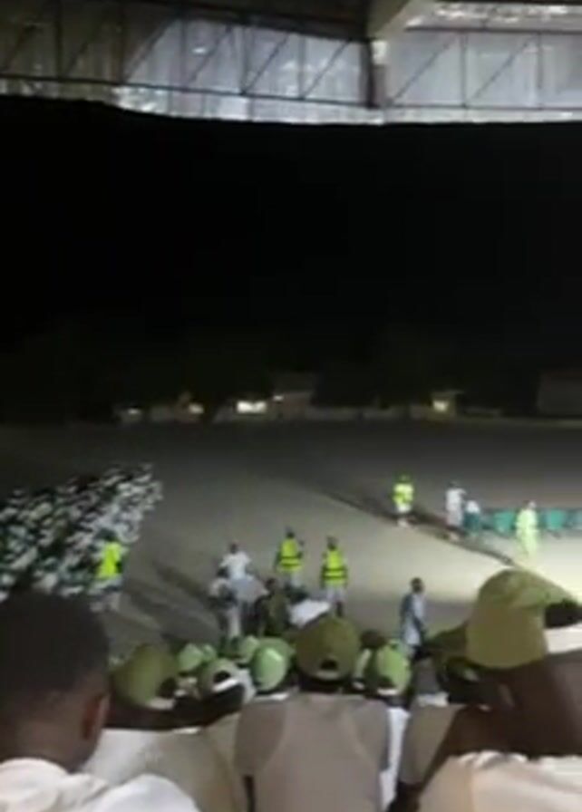 large group of people gathered at night, possibly in a stadium or large covered area. The majority are wearing white shirts and green caps, suggesting a uniform or common affiliation. Some individuals are also wearing fluorescent yellow vests. The crowd seems to be observing something happening on the field in front of them. There are multiple rows of seated individuals, with the camera positioned among them. The setting appears to be a well-lit open space, possibly a parade ground or sports field, with some buildings visible in the background.