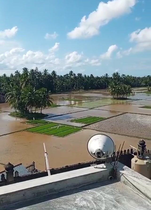 view from a rooftop overlooking a flooded rice paddy. The sky is blue with scattered white clouds. In the distance, there is a line of trees, primarily palm trees. The paddy fields are a mix of brown, muddy water and some areas of green rice plants. On the rooftop are a metal object resembling a loudspeaker, some antennas or rods, and a water tank. The rooftop itself is concrete and appears to be old and weathered.