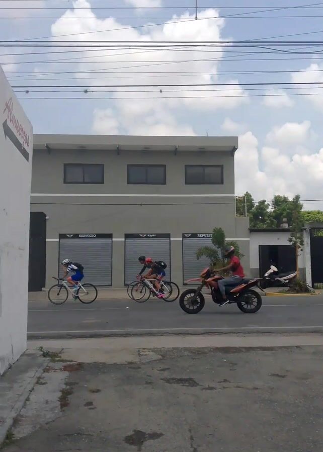 street scene during daytime with cyclists riding on the road next to a gray building with closed roll-up doors labeled "Servicio" and "Repuestos." There are three cyclists visible at first, followed by a red scooter with a rider. The video then shifts to show a cyclist riding past a white wall with an arrow pointing to "Almuerzos." The sky is partly cloudy, and there are utility poles and wires overhead. The road is paved and has some cracks.
