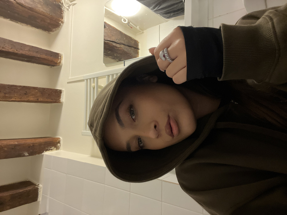 A young woman in a brown hooded sweatshirt poses indoors. She wears a large ring and has neutral makeup. The background features white tiled walls, wooden beam accents, and a small mirror reflecting a similar beam. The image is slightly tilted.