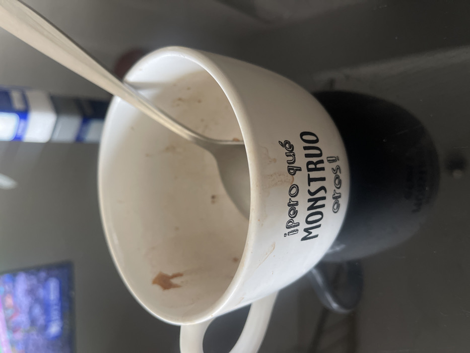 An empty white mug with black accents sits on a reflective surface. A silver spoon rests inside the mug. The mug has a message in Spanish that says "¡Pero qué MONSTRUO eres!" The inside of the mug has stains and remnants of food or beverage. A blurred television screen and a blue and white object are visible in the background. The mug has a large handle.