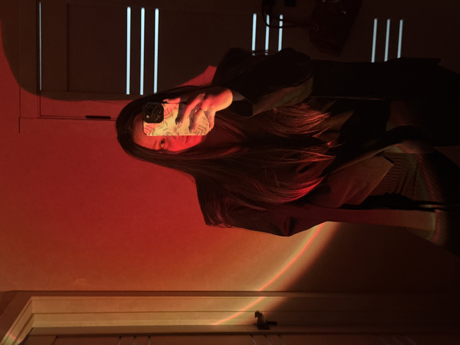 An indoor scene in Tliustenkhabl', Russia, depicts a person taking a mirror selfie. The subject, a female with long dark hair, wears a dark top and an oversized dark blazer. She holds a smartphone in her right hand, obscuring most of her face except for her left eye and forehead. The smartphone features a light-colored case with a floral or leafy pattern and a visible triple-lens camera module. A ring is present on her right ring finger. The environment is illuminated by a projected light source, creating a prominent red and orange circular gradient on the wall to the left of the subject. A white door frame is visible on the far left. To the right of the subject, a dark vertical surface, possibly another door or a panel, exhibits three horizontal light-colored stripes. The overall lighting conditions are dim, with the projected red light dominating the scene.