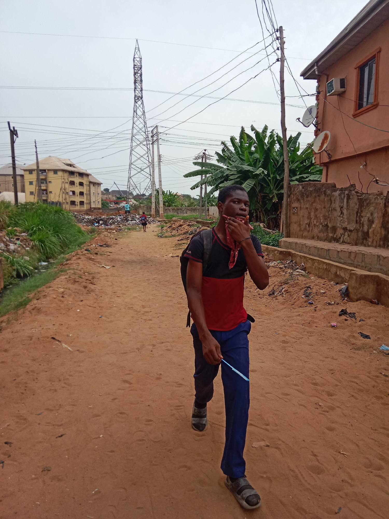 The image displays an unpaved, reddish-brown dirt path in a semi-urban area of Onitsha, Nigeria, under an overcast sky. In the foreground, a young Black male walks towards the camera. He wears a black and red short-sleeved collared shirt, dark blue trousers, and dark sandals. A black backpack is on his left shoulder. His right hand holds a red and white patterned cloth to his mouth/chin, while his left hand holds a light blue pen or stick. He has a dark bracelet on his right wrist. To the right, a peach-colored two-story building is visible, featuring a dark-framed window, an external air conditioning unit, and two white satellite dishes mounted on its wall. A concrete wall, partially damaged, runs along the building's base. Behind this building, large green banana plants grow, and a wooden utility pole supports multiple overhead electrical wires. On the left side of the path, a drainage ditch is partially obscured by tall green grass and a significant accumulation of litter and debris. Further down the path, a large mound of refuse is prominent. Two distant individuals are discernible near this refuse mound, one in a light blue top and another in a darker top. In the mid-ground on the left, a multi-story yellow building with multiple balconies stands. A tall, metal lattice transmission tower dominates the background, with numerous power lines crisscrossing the sky. Additional wooden utility poles are visible throughout the scene. The ground is consistently a reddish-brown dirt, showing various footprints and scattered small pieces of litter.