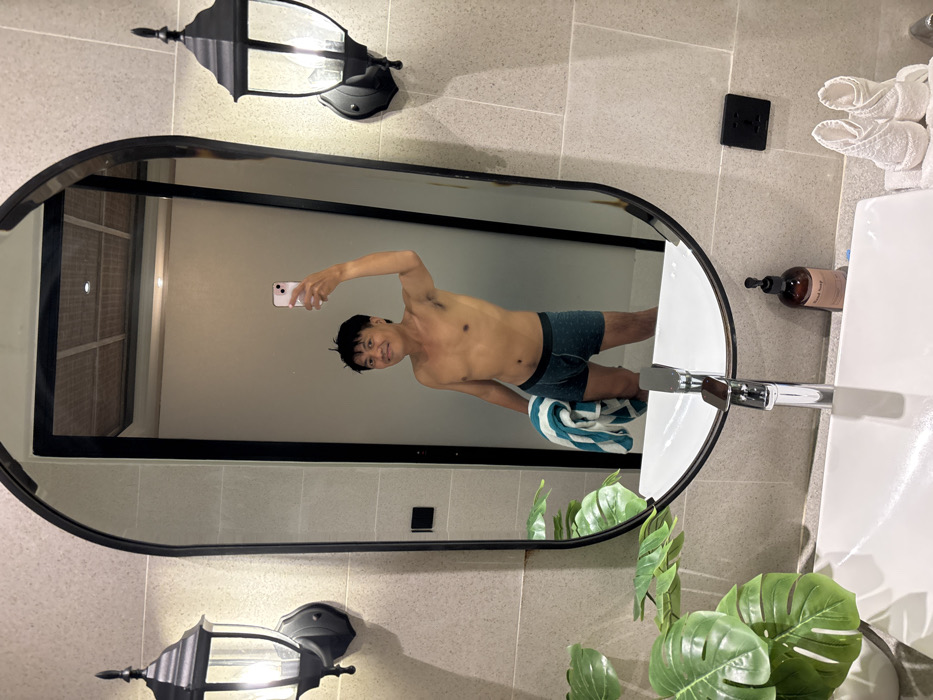 In a modern bathroom located in Kerobokan, Indonesia, an adult male of apparent Southeast Asian descent is captured in a mirror selfie