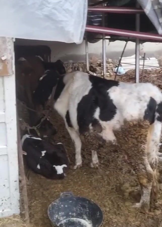 small, enclosed, muddy area with several cows. The cows are predominantly black and white, with some brown coloration visible. One cow is standing near a black plastic bucket, its legs and lower body covered in mud. Some of the cows are inside a small enclosure with a white door. Overhead, there is a roof with corrugated metal sheeting partially covered by draped white and blue-striped fabric. The general environment appears to be a livestock pen or shelter.