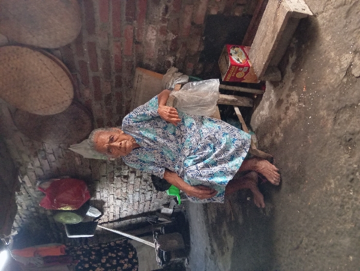An elderly woman in a patterned blue and white shirt rests in a cluttered, aged interior. The walls are a mix of brick and rough concrete. Woven items hang on the brick wall. A food box and other items rest on a makeshift shelf. Plastic bags and various objects litter the space. The woman's feet are bare. The scene suggests a state of poverty and neglect.