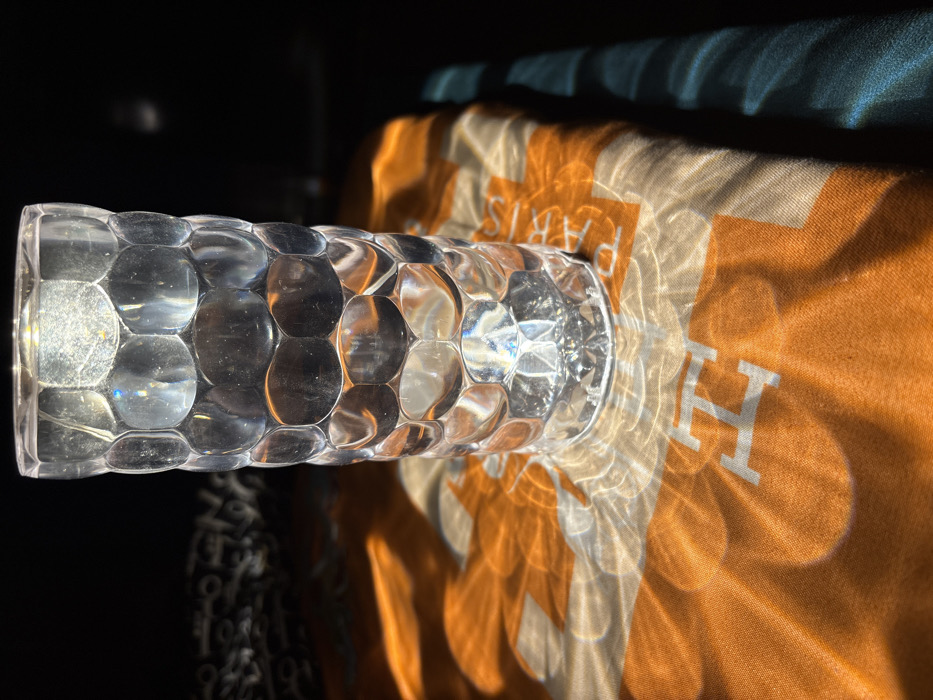 A clear glass vase with a honeycomb pattern lies horizontally on a patterned fabric. The fabric is mostly orange, with white accents forming shapes like flowers and the letter "H." Light filtering through the vase casts distorted shadows of the fabric's design onto itself. The background features dark shadows and a glimpse of dark fabric with circular designs. The light and shadows create an interesting interplay of textures and patterns.