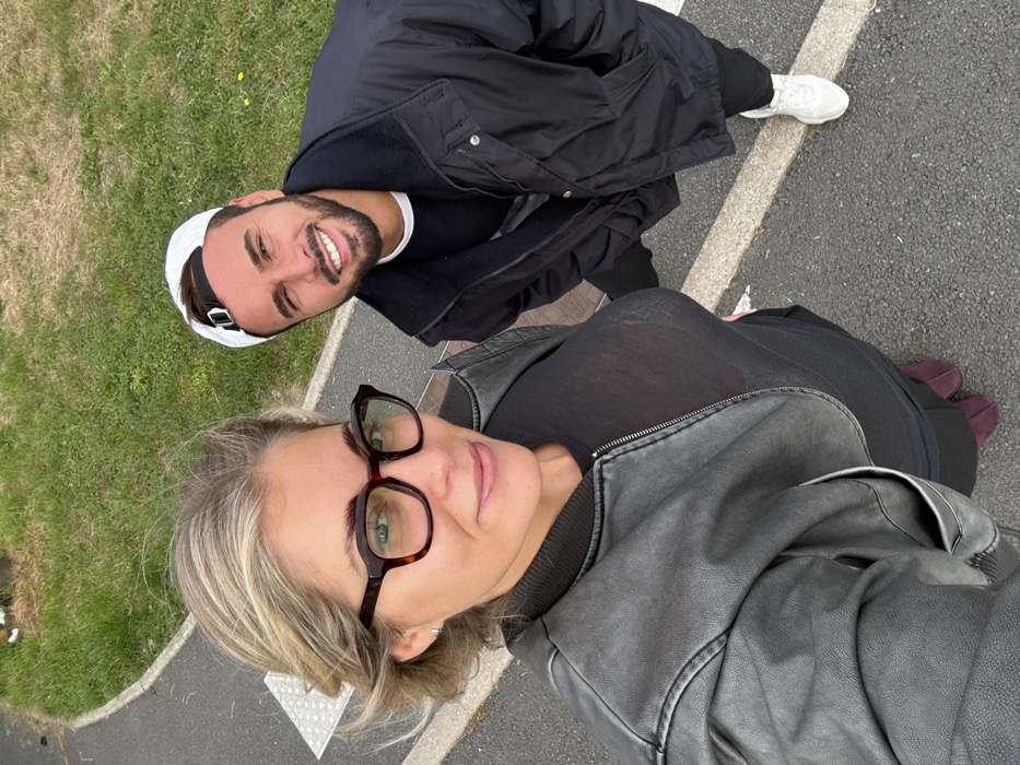 A selfie-style photograph taken outdoors in Wattrelos, France, features two smiling individuals