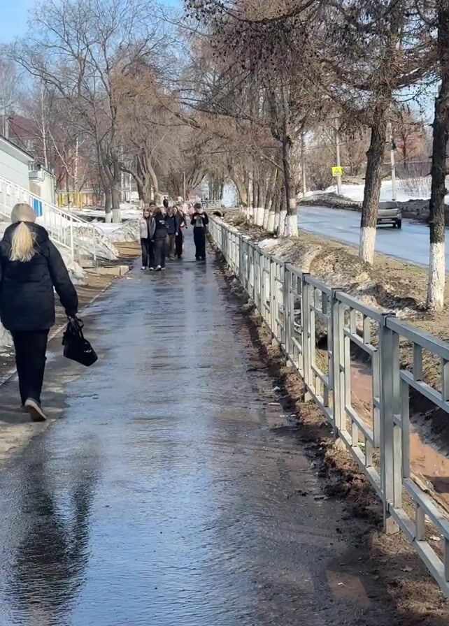 group of people walking on a wet, icy sidewalk. A woman with blonde hair walks in front, away from the camera, carrying a black bag. A group of young people walks toward the camera behind her. The sidewalk is bordered by a metal fence on one side and patches of melting snow on the other. Bare trees line the sidewalk. A road with passing cars can be seen to the right of the sidewalk. The sky is blue.