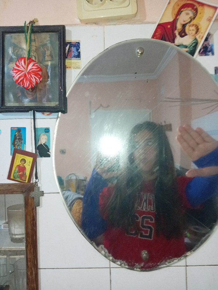 An oval, scratched mirror, mounted on a white tiled wall in an interior setting within Войводино, Bulgaria, reflects a person. The person, with long dark hair, is wearing a red long-sleeved shirt with blue undersleeves, and their left hand is raised, palm forward, partially obscuring their face and reflecting a bright light source. To the upper left of the mirror, a rectangular framed religious icon depicting multiple figures hangs. A red and white striped spherical ornament with green and yellow cords is suspended from its top. Below this, a smaller rectangular framed icon of a saint is visible, from which a metallic cross hangs by a black cord. Two small stickers, one depicting Boba Fett and another an anime-style female character, are affixed to the tiled wall below the larger framed icon. Above the large framed icon, a beige double electrical outlet is horizontally mounted. To the upper right of the mirror, a religious icon depicting the Virgin Mary and child is affixed to the wall. Below the mirror, a wooden frame reveals a clear glass tumbler and other indistinct objects on a shelf. The room reflected in the mirror appears to have light-colored walls.
