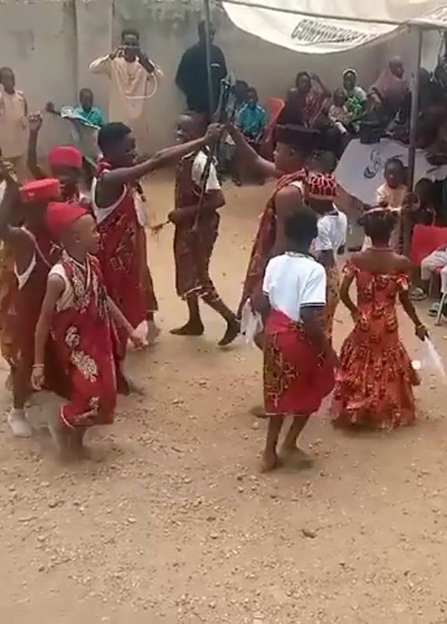 The video depicts a group of children, some wearing red and brown traditional African outfits, dancing in a circle on a sandy ground. Several of them have red caps. A woman in a yellow and orange patterned dress dances alongside them. A crowd of people, including children and adults, is seated on chairs, watching the performance. There's a white canopy overhead. In the background, there's a wall and some cinder blocks. A man is standing and taking pictures with a device. The video is taken with a device marked with "TECNO SPARK".