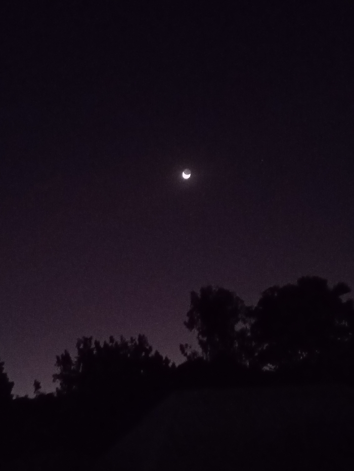 This image, captured in Vom, Nigeria, depicts a nighttime scene. A bright waxing crescent moon is centrally positioned in the upper mid-frame, with its illuminated curve oriented towards the right. A faint, pinpoint light source is visible to the moon's right. The sky transitions from deep black in the upper regions to a subtle reddish-purple haze closer to the horizon. The lower third of the frame is occupied by a dark, continuous silhouette of dense tree foliage, completely devoid of internal detail. The immediate foreground below the tree line is uniformly black. No individuals, animals, or artificial structures are discernible within the frame.
