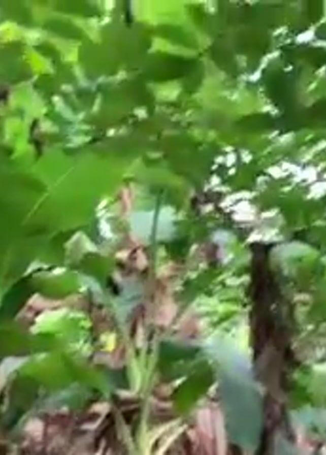 lush, overgrown garden or yard. There are banana trees, taro plants, and other greenery. Some of the banana leaves are brown and dry. The camera pans upward, revealing more of the trees and a glimpse of a white house in the background. The camera then focuses back down, showing a mass of dense vegetation on the ground. There appears to be a bunch of green bananas lying on the ground among the leaves and other plants.