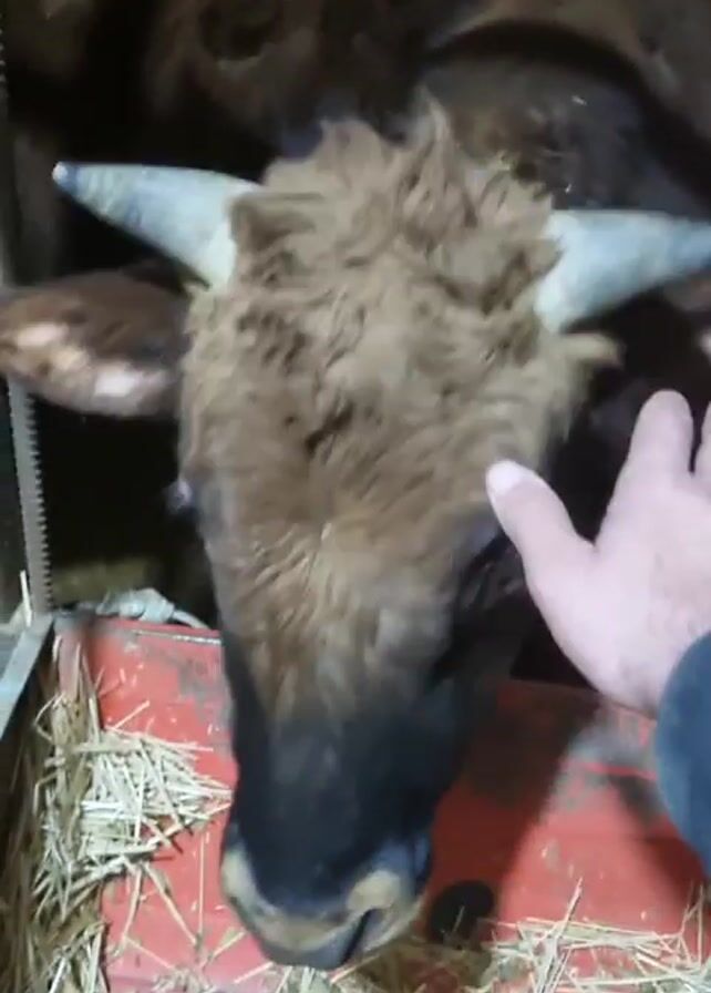 The scene features a dark brown cow with small horns, eating hay from a red feeder. A hand, presumably belonging to a person, gently pets the cow’s face and head. The cow is wearing a blue collar. The surrounding environment appears to be a barn or stable, dimly lit, with another cow visible in the background.