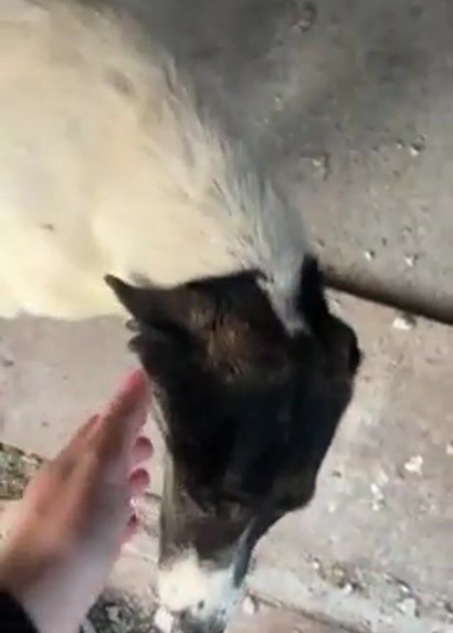person petting a medium-sized dog with black and white fur. The dog is standing on a concrete floor. The person's hand strokes the dog's head and ear. The dog looks up at the person. The environment is a simple, possibly unfinished or utilitarian indoor space.