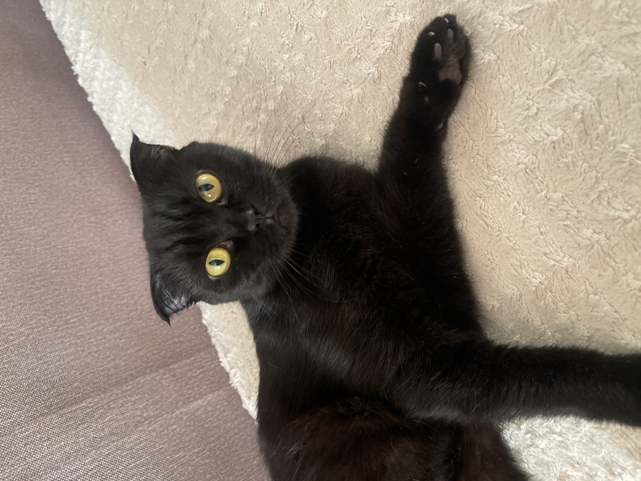 A black domestic cat is depicted resting indoors in Нижняя Уратьма, Russia. The cat, exhibiting characteristics consistent with a Scottish Fold breed, possesses short, black fur, distinctly folded ears, and prominent, round yellow eyes with dark pupils, fixed directly towards the viewer. Its body is in a prone position, with the right front paw extended onto a light-colored, textured surface, possibly a blanket or rug, featuring a subtle, repetitive relief pattern. A darker, vertically-ribbed upholstered surface, likely a sofa, is visible in the background to the left. No other subjects or objects are present within the frame, and the cat appears to be in a calm, stationary state.