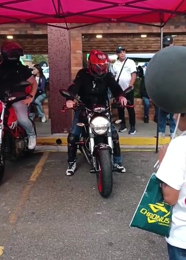 motorcyclist sitting on a motorcycle, under a red canopy. The rider wears a red helmet, black jacket, jeans, and white sneakers. The motorcycle is black with red accents on the wheels. The rider appears to be posing for the camera. The environment includes a brick building, other motorcycles, and several people watching or walking by. The ground is asphalt, and a person carrying a "Chronus" lubricant shopping bag is partially visible in the foreground. The atmosphere seems to be casual, possibly at a motorcycle event or gathering.