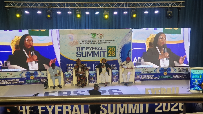 An indoor stage setup is depicted, hosting a panel discussion at "THE EYEBALL SUMMIT 2026," organized by the Optometrists & Dispensing Opticians Registration Board of Nigeria, presumed to be located in Abuja, Nigeria