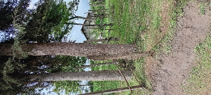 The image captures an outdoor rural scene in Rwanyambo, Kenya, under a partly cloudy sky. In the foreground, a dirt path or embankment displays areas of exposed soil and sparse green vegetation. Two prominent tree trunks rise vertically from the ground; one, textured with dark brown bark, is slightly right of center, while another, lighter-barked trunk stands to its left. A thin, dark vertical pole is also visible on the far left. The middle ground consists of tall green grass, interspersed with bushes, and features a rudimentary fence constructed from irregular wooden posts and intertwined branches. Behind this natural barrier, a weathered, light-colored wooden structure with vertical plank siding and a gabled roof is partially discernible. The background is composed of dense green tree canopies against a pale blue sky. No individuals, animals, or specific actions are observed.