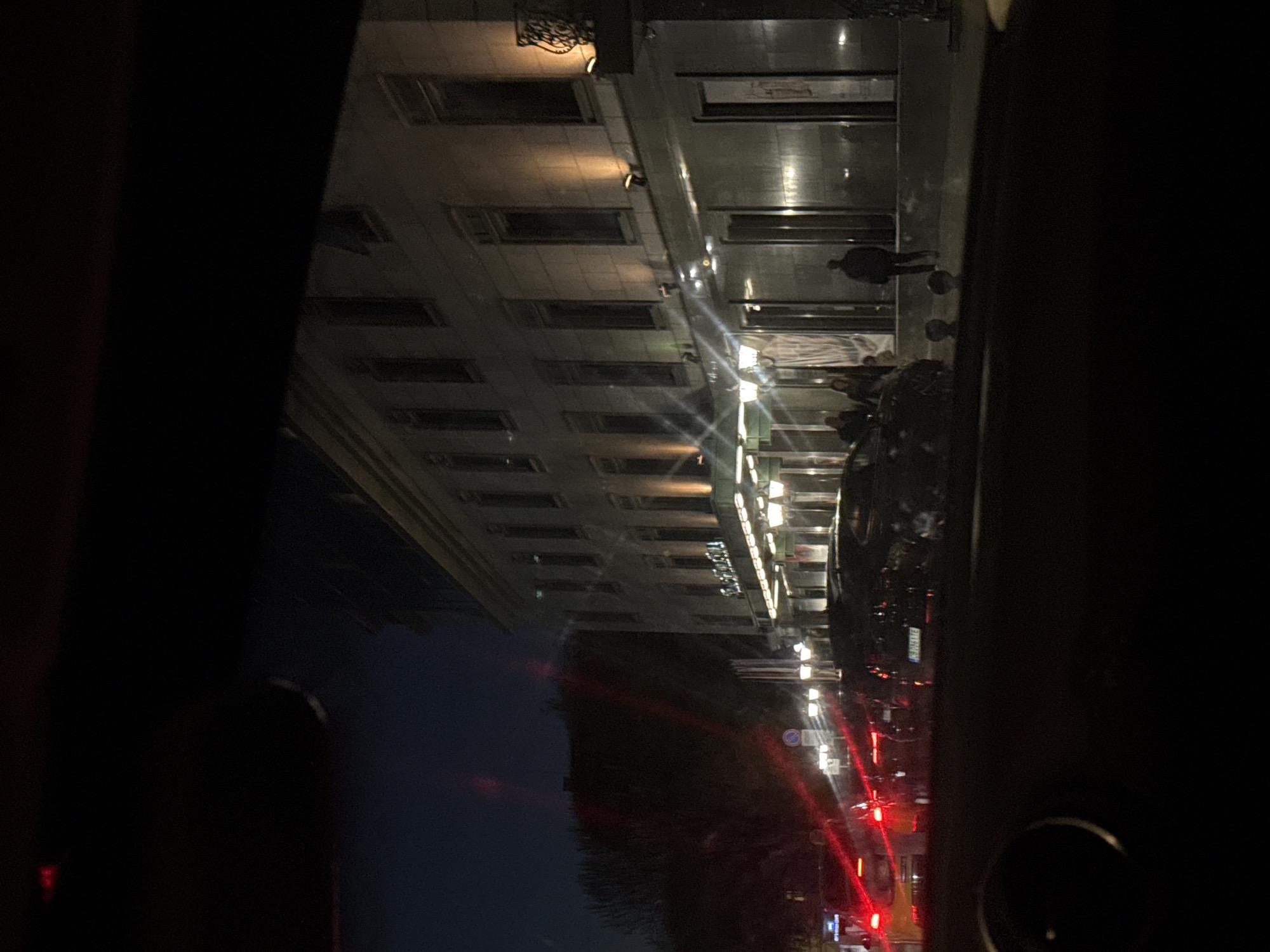 The image depicts a night scene in Sofia, Bulgaria, as viewed from inside a car. The camera is positioned at an angle. Outside the car window, the illuminated façade of a building is visible. A group of people stands in front of the building's entrance. Red lights from traffic and streetlights can be seen further down the street, suggesting vehicular activity. The sky above is dark with some hints of blue.