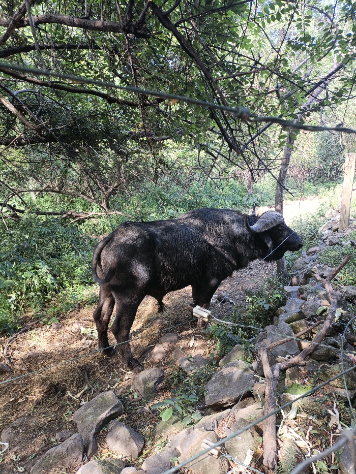 - "An African buffalo (Syncerus caffer) stands on a dirt path within a natural, fenced enclosure, identifiable as likely being in the Kisumu Impala Sanctuary in Kisumu, Kenya" by FM-E7sSL2, licensed under CC BY 4.0