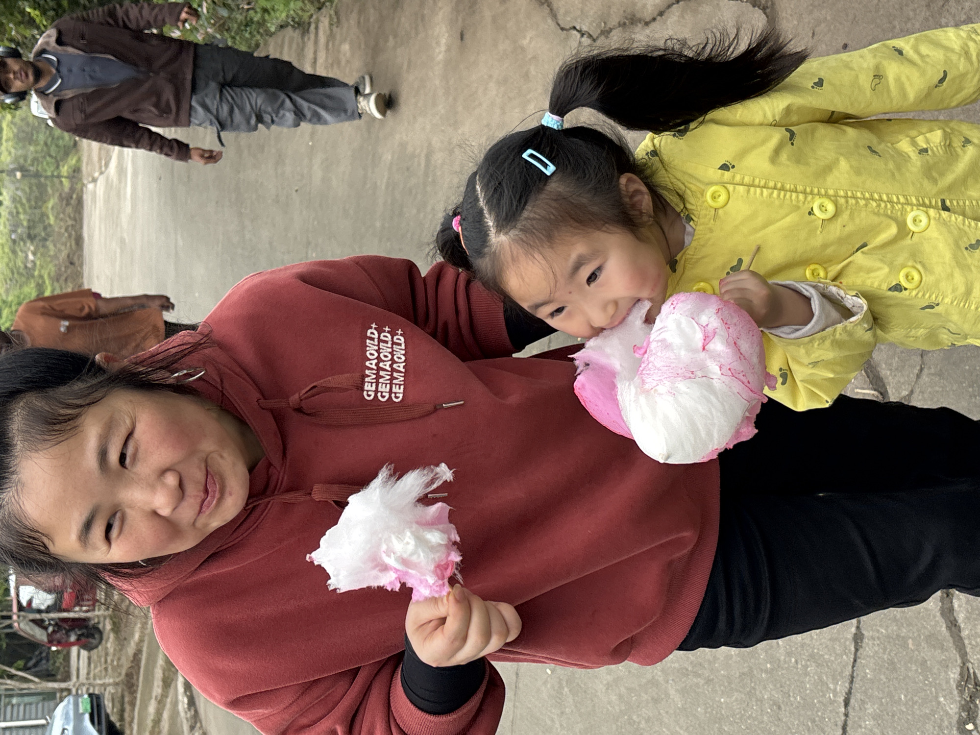 A woman and a young girl are prominently featured in the foreground, sharing a pink and white cotton candy treat. The woman is wearing a red hoodie with white lettering, and black pants. She holds a smaller portion of cotton candy in her hand. The young girl, positioned beside her, is wearing a yellow jacket with small decorative footprints. Her hair is styled in pigtails with blue hair clips. Both are eating the cotton candy. In the background, there is a road with a man walking away in the distance. He is wearing a brown jacket over a gray shirt, and dark pants. Other blurred figures and objects are visible in the periphery, including a glimpse of vegetation on the left side. The scene appears to be set outdoors. The city is Xianfeng, China.