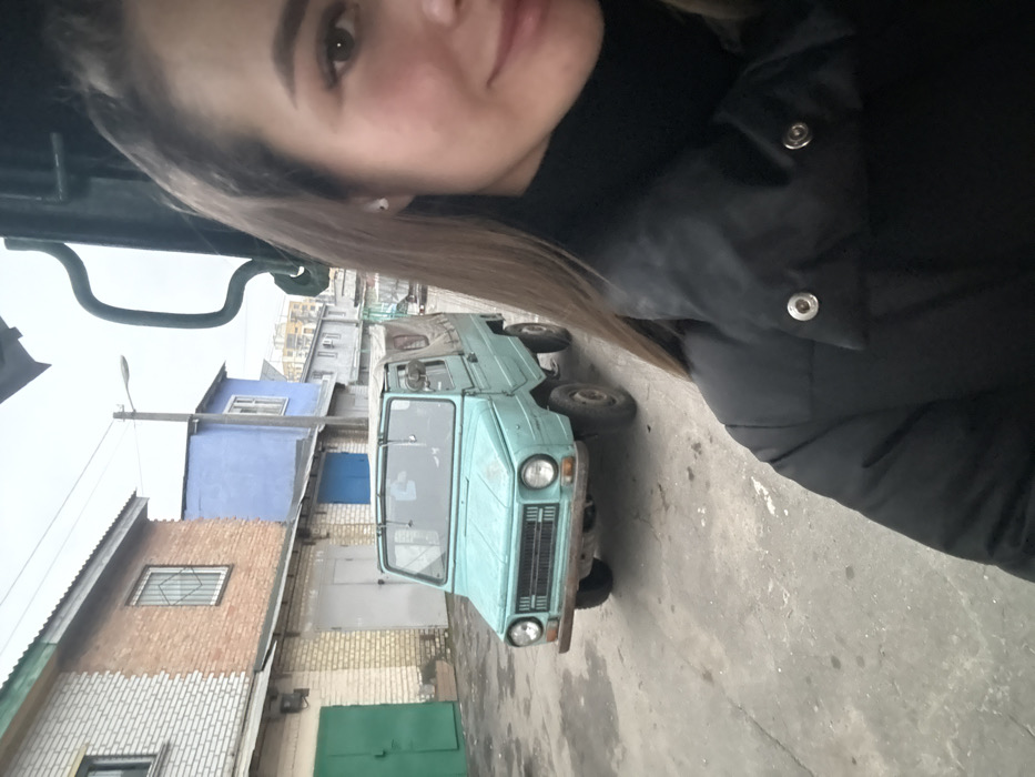 The image displays an urban street scene in Kyiv, Ukraine, with a person in the foreground and a parked vehicle amid buildings. The right side of a person's face and upper torso are visible in the foreground, suggesting a selfie-style shot. The individual has long, dark brown hair and a light complexion, exhibiting a faint smile. They are wearing a black turtleneck under a black puffer jacket with two visible silver snap buttons on the collar. A white stud earring is present in the right earlobe. An irregular dark structure partially frames the top right corner of the image. In the midground, an older, light teal-colored ZAZ-969 LuAZ utility vehicle is parked on a grey, paved surface. The vehicle features a canvas soft-top, round headlights, and a multi-slatted horizontal grille, showing signs of weathering. The background consists of an urban street lined with buildings. To the left, a two-story structure has a white brick ground level with a green and a white garage door, and an orange-brown brick upper level with barred windows. Further down the street, a smaller building painted blue with white window frames is visible. In the distant background, taller, multi-story residential buildings are discernible. A utility pole with a street light is positioned on the left side of the street. The sky is overcast and grey.