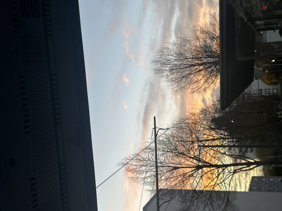 The image depicts an urban or suburban scene in Hœnheim, France, viewed from inside a vehicle, likely a tram or bus, indicated by the dark, perforated ceiling structure visible across the top approximately 15% of the frame. The sky occupies the majority of the upper two-thirds, exhibiting a sunset or sunrise gradient from vibrant orange and yellow near the horizon, transitioning to light blue overhead, with scattered pink and grey stratified clouds. Numerous bare deciduous trees are silhouetted against the illuminated sky, occupying the central and lower portions of the frame. On the far left, a light-colored, multi-story residential building is partially visible. An overhead wire support pole with a horizontal arm, consistent with a tram line, extends from the left mid-ground. In the lower right quadrant, a dark-colored, modern public transport shelter with a sloping roof and glass panels is partially visible. No individuals or specific actions are discernible within the scene.