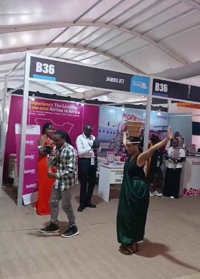 Three women are performing a traditional dance in what appears to be a large convention hall. They are wearing matching green dresses and have what looks like woven baskets balanced on their heads. The hall has various booths set up, with people standing around observing the performance and taking pictures. The booths have signage with brands and logos. The floor is a light-colored wood grain. The hall has a white, tent-like ceiling with visible support beams. A man in a white shirt and black pants is standing near one of the booths, taking a photo of the dancers. Others in the background are also observing and recording.