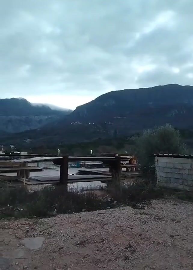 n outdoor scene under an overcast sky, with distant mountains in the background. In the foreground, there's a gravelly dirt area. Beyond this, there's a wooden structure resembling a series of interconnected platforms, possibly tables or stages. To the right of the wooden structure, there's a small, unfinished cinder block wall. Sparse vegetation is scattered around the gravel and near the structures. The sky is a muted gray, and the mountains appear dark and slightly hazy. There are no people visible in the frame. The camera remains static throughout the video.