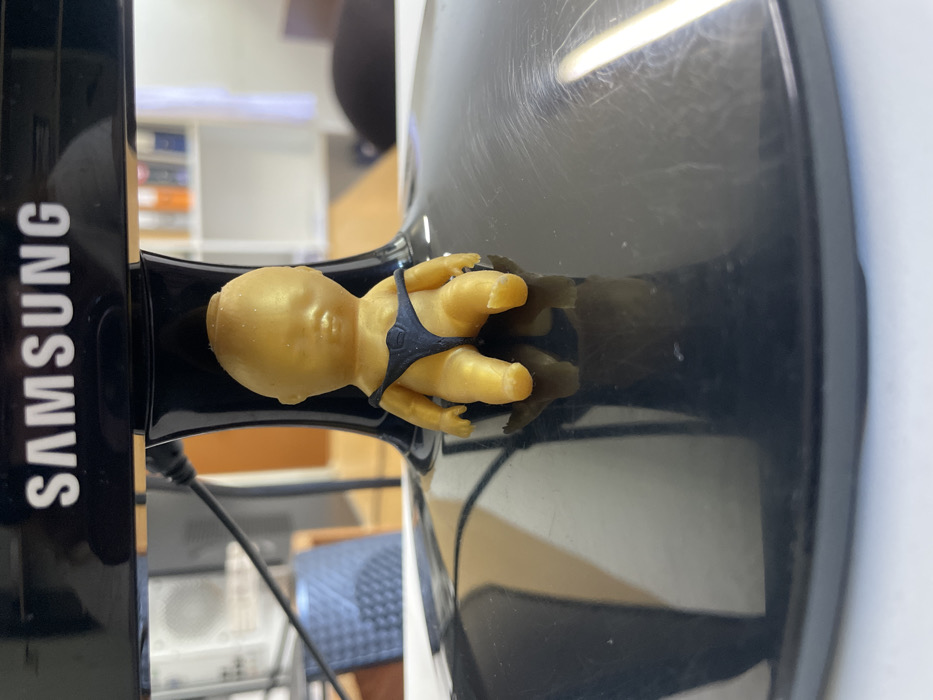 An indoor scene in an office in San Carlos de Bariloche, Argentina, depicts a small, golden-colored figurine seated on the glossy black base of a computer monitor stand. The figurine, approximately 6-7 cm tall, is a stylized human infant figure with smooth, featureless contours for the face and body. It is adorned with a small, dark-colored garment resembling a thong or bikini bottom, which features a lighter-colored emblem on the front. Above the figurine, the white "SAMSUNG" logo is visible against the black frame of the monitor. The monitor stand reflects portions of the figurine and the blurred office background. The background elements, out of focus, include a dark, textured office chair to the left, and light-colored desks and a white shelving unit with various items to the right. No individuals are present in the frame.