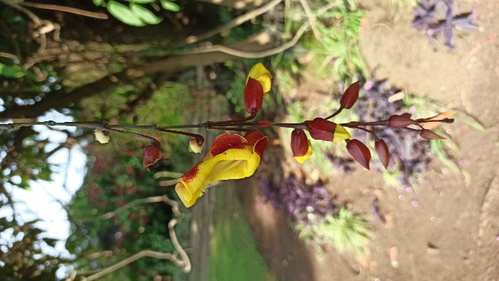 - "A *Thunbergia mysorensis* (Lady Slipper Vine) inflorescence is centrally positioned, hanging vertically, showcasing multiple yellow and dark red blossoms and buds on a slender, dark stem" by FM-oIWu62, licensed under CC BY 4.0