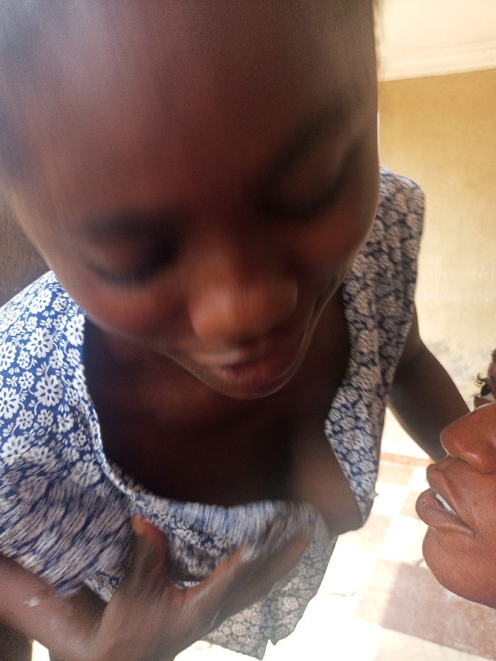 The image depicts two individuals with dark skin in close proximity within an undetermined indoor or semi-enclosed location in the city of Unknown, Unknown. The primary subject, positioned centrally, wears a blue top with a white floral pattern. Their head is tilted downwards and to the right, with eyes directed away from the camera and mouth slightly open. Their left hand is visible near the chest, with fingers slightly splayed, possibly adjusting clothing. To the immediate right, a secondary individual's lower face is partially visible, showing the nose, lips, and chin, with the mouth slightly open. The background consists of a blurred light brown wall, and the lower right foreground shows a blurred tiled floor with light-colored square tiles and darker grout. Lighting is bright and ambient.