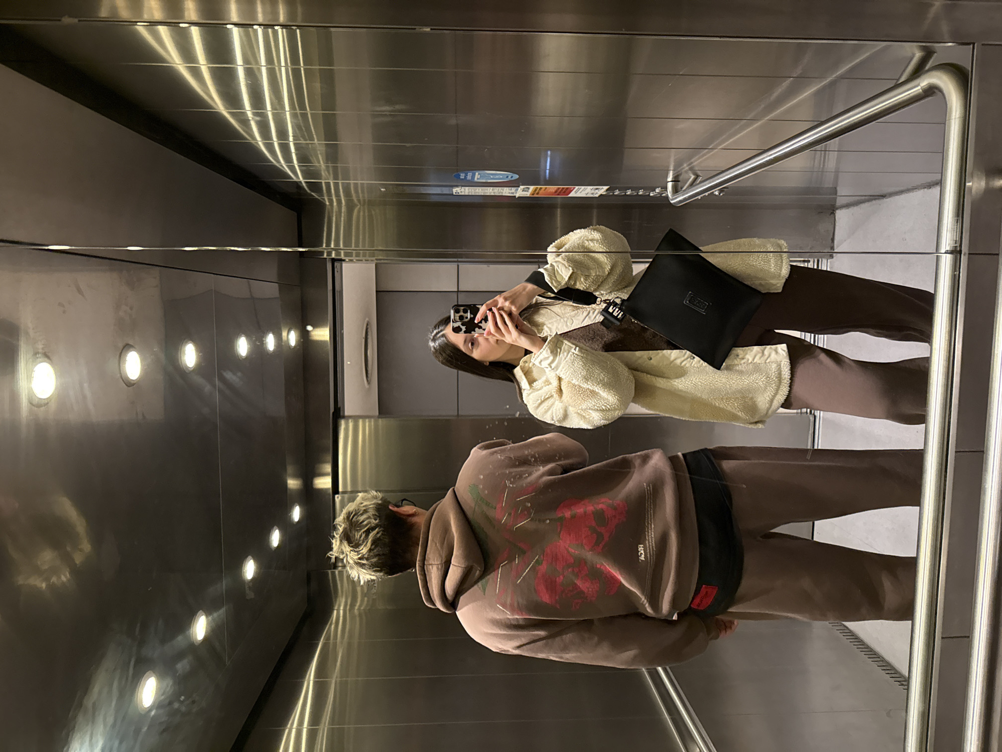 A mirrored image depicts two individuals in an elevator. One person, standing further back, wears a brown hoodie with a red floral graphic on the back and brown pants. The other individual, seemingly taking a selfie, wears a tan, sherpa-style jacket, brown pants, and holds a phone with a cow-print case. A black bag is visible. The elevator's interior is stainless steel with recessed lighting. A handrail is on the side, and a panel with a blue sticker is visible on the back wall. The location is likely in Sofia, Bulgaria.