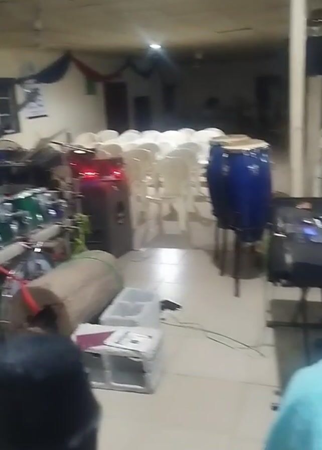 The video captures a scene inside a room with several rows of white chairs arranged as if for an event or gathering. The room is brightly lit, and the floor is covered with light-colored tiles. Several musicians are present, setting up equipment or preparing to perform. Initially, the focus is on a man playing an electric guitar, then pans to a man sitting at an electronic keyboard. A woman with a towel draped over her head is also visible in the shot, seated in the foreground, and the camera subsequently shifts to a man smiling and holding several microphones. Scattered around the musicians are various musical instruments, including drums, congas, and a speaker. There are also some rolled-up materials and other equipment on the floor.
