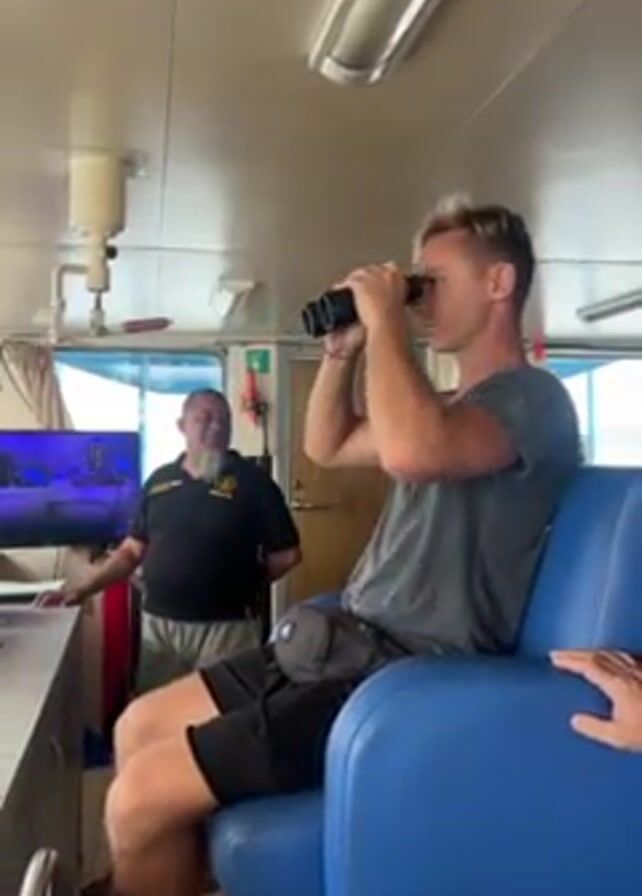 interior of a boat. A man with short blonde hair sits in a blue chair, looking through binoculars. An older man in a black t-shirt and khaki shorts stands next to a counter behind him, smiling and watching him. A television monitor is visible to the left. Another person's hand appears briefly on the right. The man with binoculars points his finger upwards.
