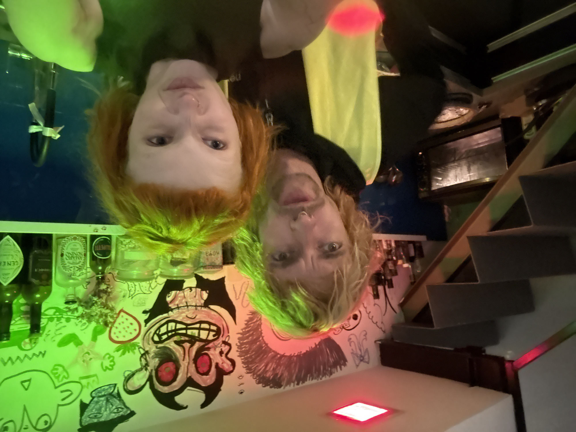 An interior scene captured from a low angle shows two individuals in what appears to be a residential space or creative studio in Tel-Aviv, Israel. The environment features a unique blend of industrial and artistic elements under vibrant, colored lighting. In the foreground, slightly to the right, is a pale-complexioned female with short, choppy, bright orange hair and a septum piercing on her left nostril. She wears a dark, high-necked top and looks directly at the camera with a slight scowl or grimace. Her right hand is partially visible, appearing to hold the camera. Behind her and slightly to the left stands a pale-complexioned male with long, blonde, somewhat disheveled hair, a mustache, a beard, and a septum piercing. He wears a dark top, possibly a hoodie, with a bright yellow fabric draped over his left shoulder. He also looks directly at the camera with a neutral expression. The background features a white wall extensively covered with black-outlined, cartoonish graffiti art, including a prominent demon-like figure with red eyes and a wide grin, a stylized punk rock mohawk, a red-outlined strawberry, and various abstract doodles. To the right, a dark blue backsplash or wall section supports a white shelf. On the shelf, multiple clear glass jars, one labeled "HO93", are visible alongside various liquor bottles, including "AMARO NONINO" and "GENEVA". A small bouquet of dried flowers is also present. A black kitchen faucet with a white ribbon tied around its base is situated against the blue wall. To the left, a modern, open-tread staircase with light-colored steps and dark supports ascends. Below the staircase, a silver toaster oven or small appliance and a circular pan are visible on a counter. The scene is illuminated by striking colored lights: a red rectangular ceiling fixture is visible in the upper-left, casting a red glow on the staircase. The main area, including the individuals and the wall art, is bathed in a distinct yellowish-green light.