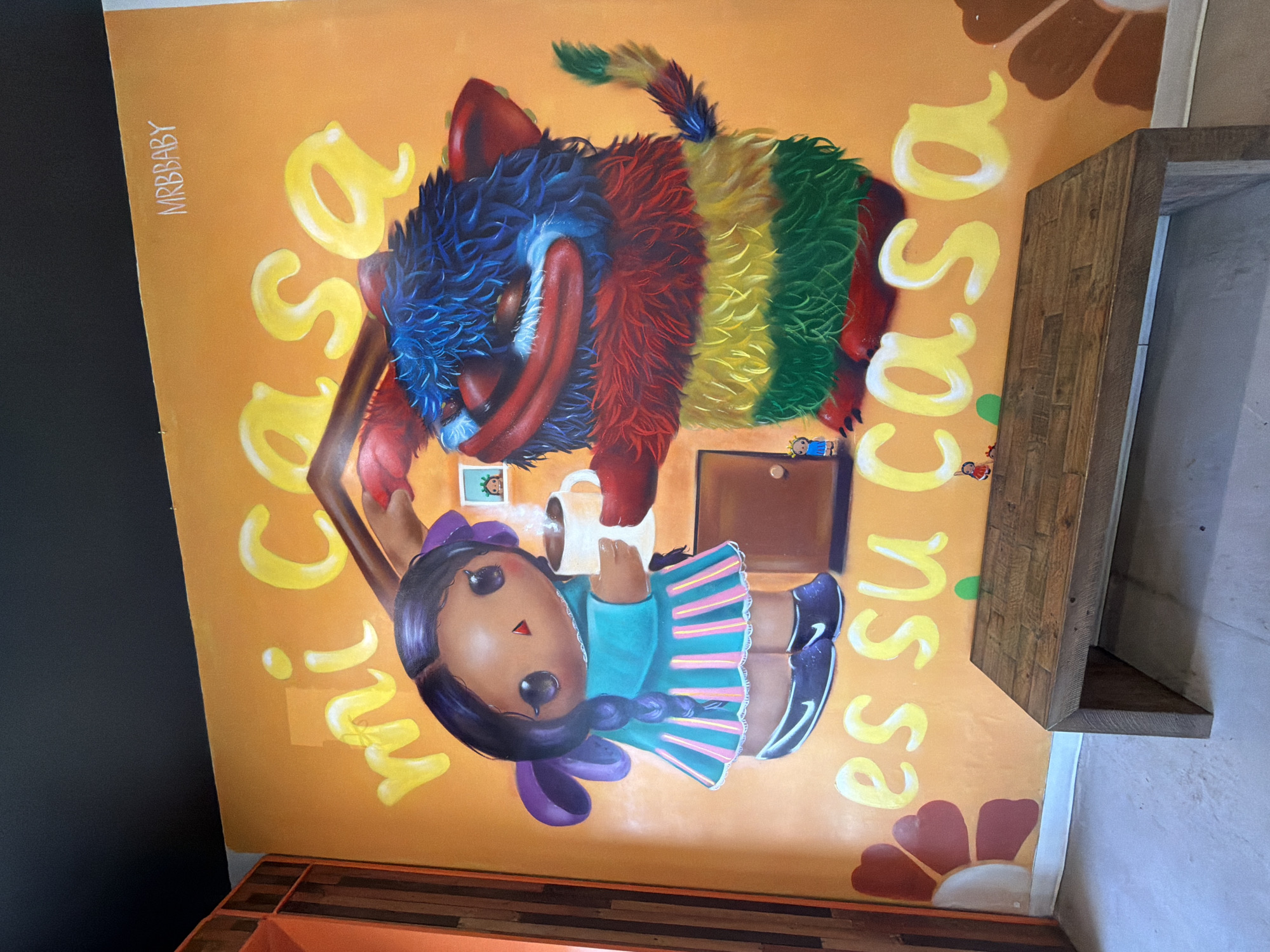 A photograph depicts a mural painted on a wall with an orange background. The mural features a cartoonish image of a girl with dark hair holding a steaming cup, possibly of hot chocolate or coffee. Above the girl is a large, colorful, cat-like piñata with a tail, composed of fringed sections in shades of blue, red, yellow, green, and red. The words "Mi casa es su casa" are painted in yellow around the figures. In the upper left, "MRBBABY" is written. A wooden shelf is attached to the wall on the right. At the bottom of the wall, a section of orange-tinted wood paneling is visible. The scene is located in the city of Los Angeles, United States of America.