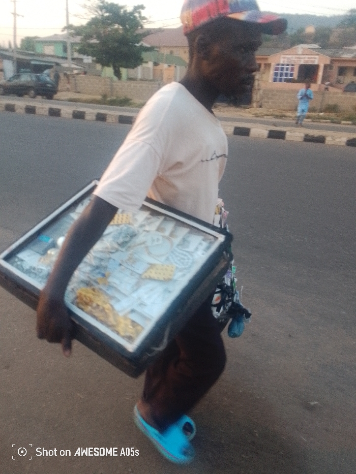 A man carries a black-framed tray of goods, likely jewelry, on his shoulder while walking on a street. He wears a light-colored t-shirt, dark pants, and a colorful baseball cap. His beard is neatly trimmed. He's also wearing blue slippers. A building is visible in the background, as well as a car parked on the roadside. Another person can be seen in the distance. The photo was taken on an Awesome A05s phone.