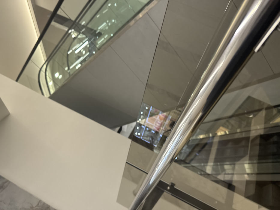 The image displays the multi-level interior of a modern commercial building, consistent with a shopping mall, located in Yambol, Bulgaria. The perspective is from an elevated position, looking downward and across. A polished chrome handrail runs diagonally across the lower-center of the frame, positioned above a transparent glass balustrade. In the background, an upward-moving escalator with glass side panels and a dark handrail is visible. The architectural elements include angular white and light gray walls. Reflections of overhead lighting and vague interior features from lower levels are discernible on the glass and chrome surfaces. No human subjects are clearly identifiable within the scene.