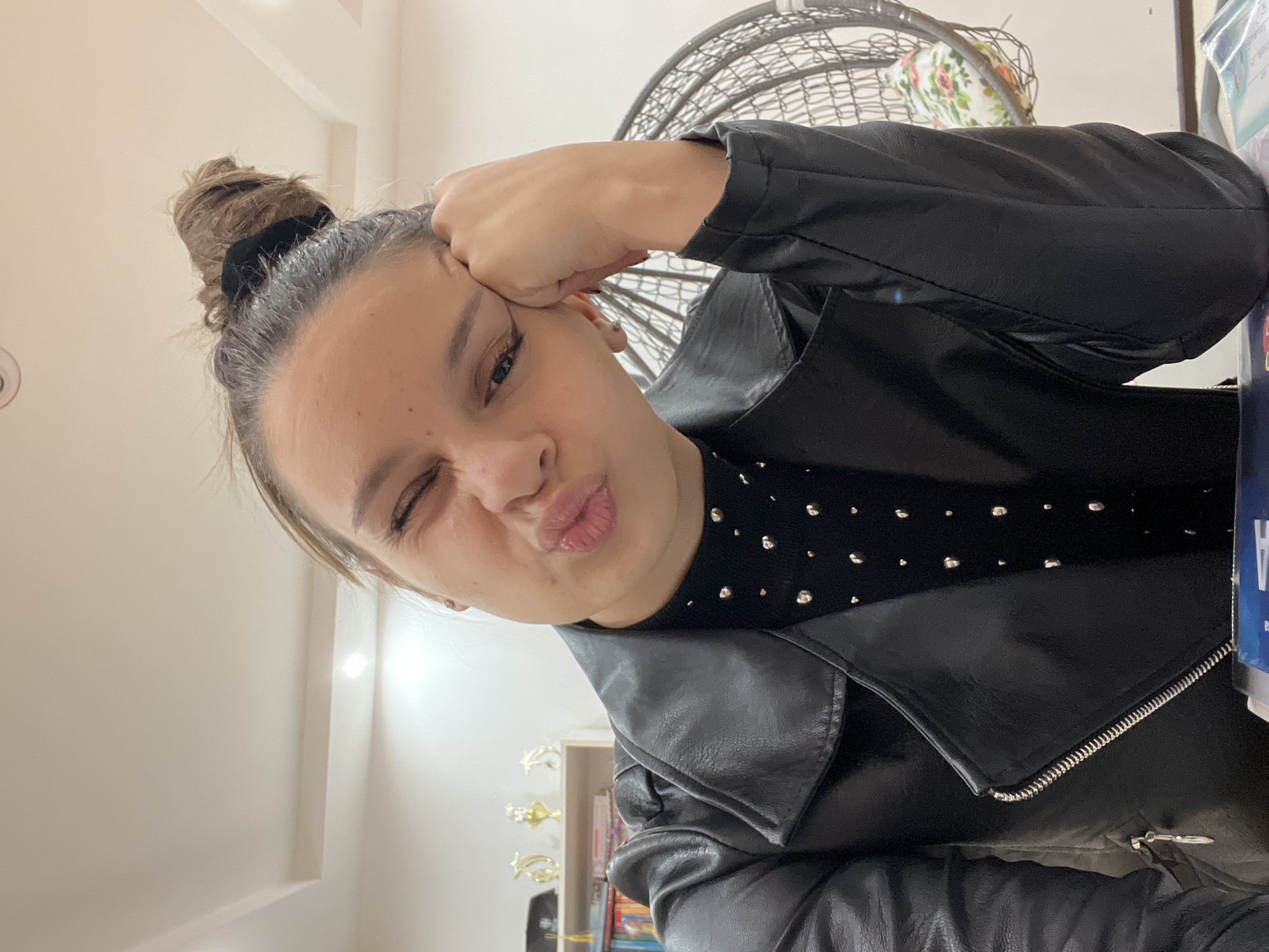 A selfie image of a young woman with light skin. She is winking and pouting her lips. Her hair is tied up in a bun with a black scrunchie. She is wearing a black leather jacket over a black top with silver studs. Her left fist is resting on her forehead. The background is a white ceiling and a decorative metal chair. A shelf of trophies and books is visible in the lower left. There is no information available to verify the location in Pernik, Bulgaria.